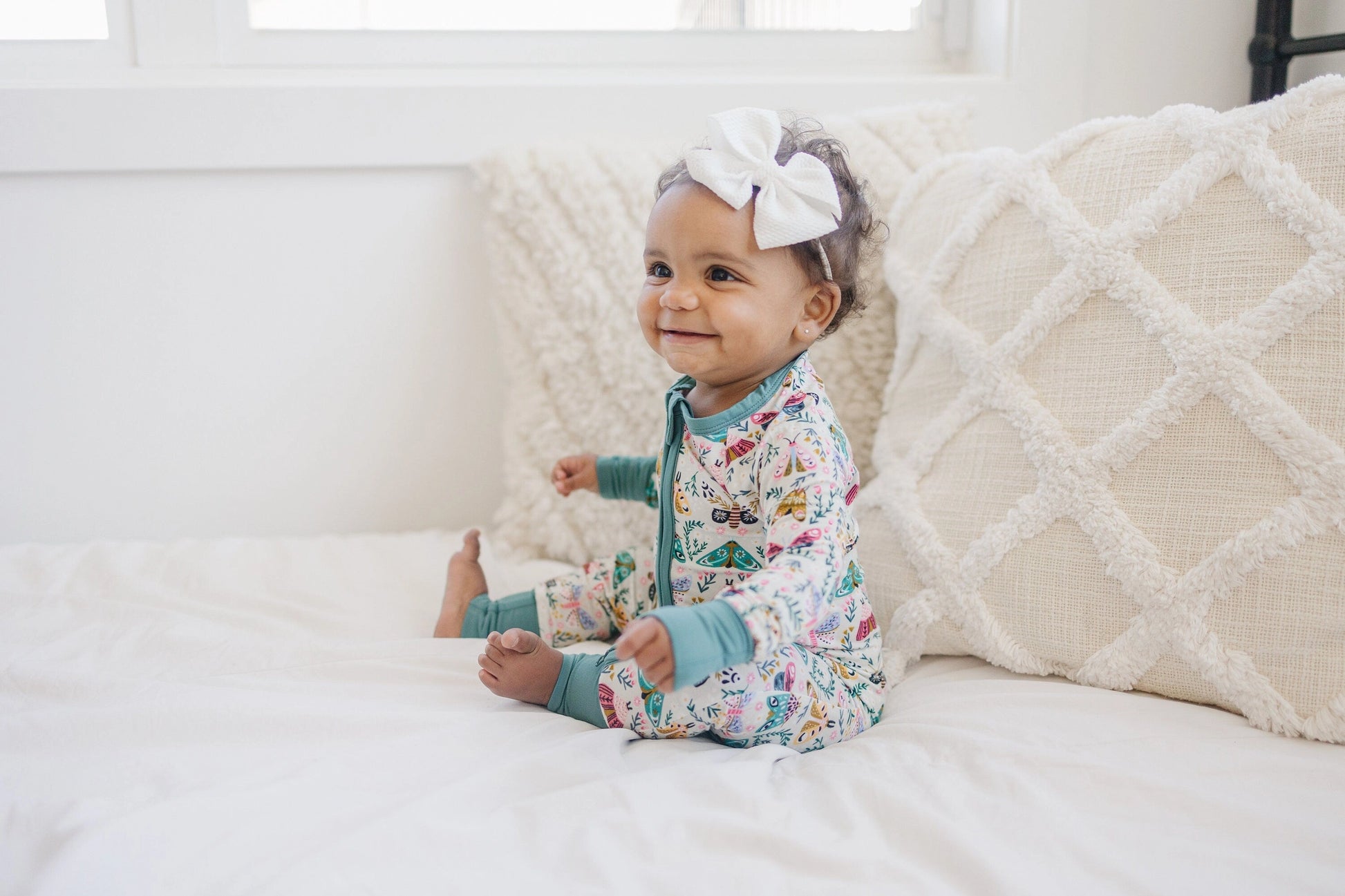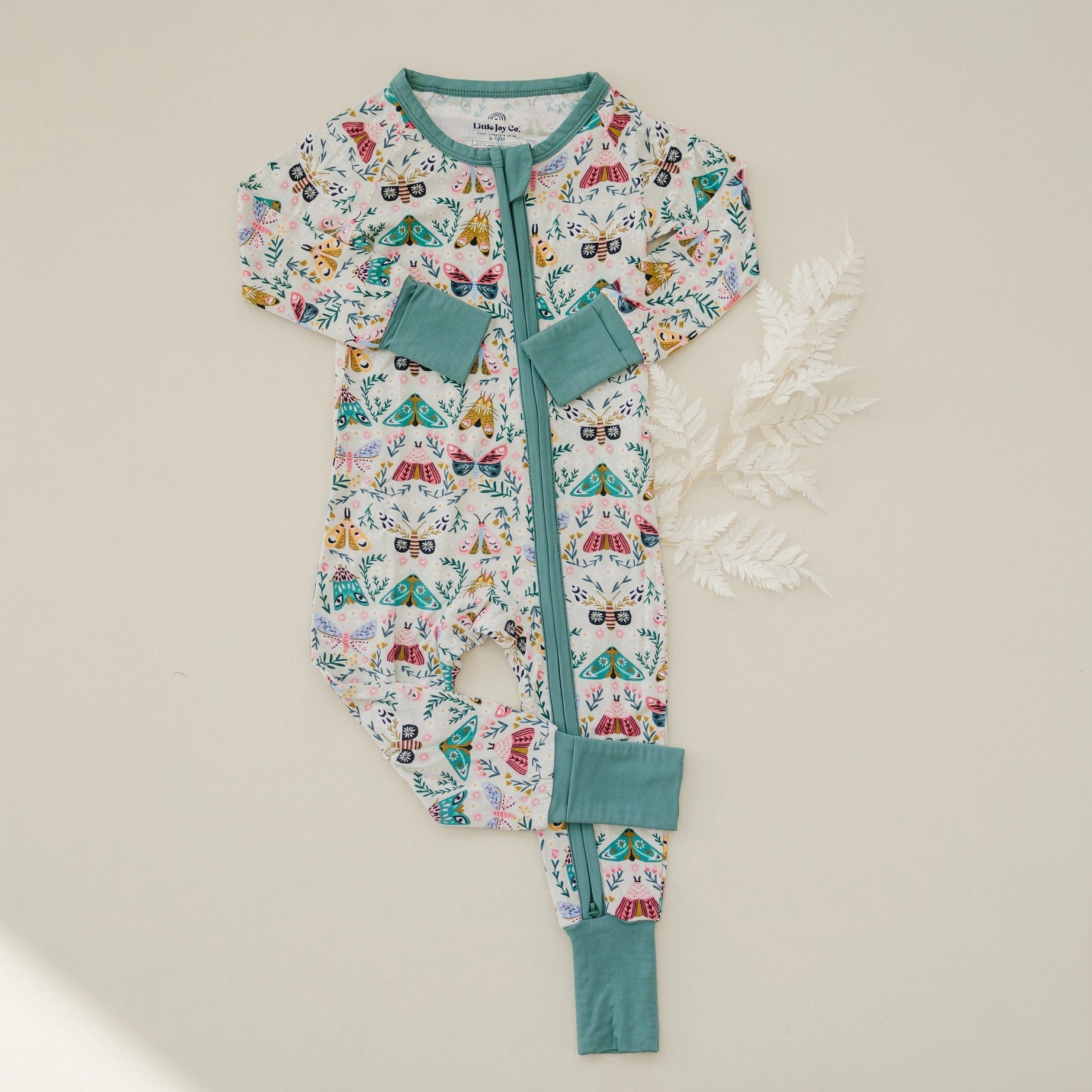 Get ready to be enchanted by our Bamboo Zippy Romper in the whimsical "Kaleidoscope Blooms" print! Not only does it feature delicate moths, but it also has foldover cuffs and feet for all sizes, including non-slip soles for sizes 9-12 months and up. Say goodbye to slippery socks and hello to cute, comfy, and practical! Providing ample room for your little one to move freely, this romper runs large. Refer to the size chart in the photos for accurate sizing details.