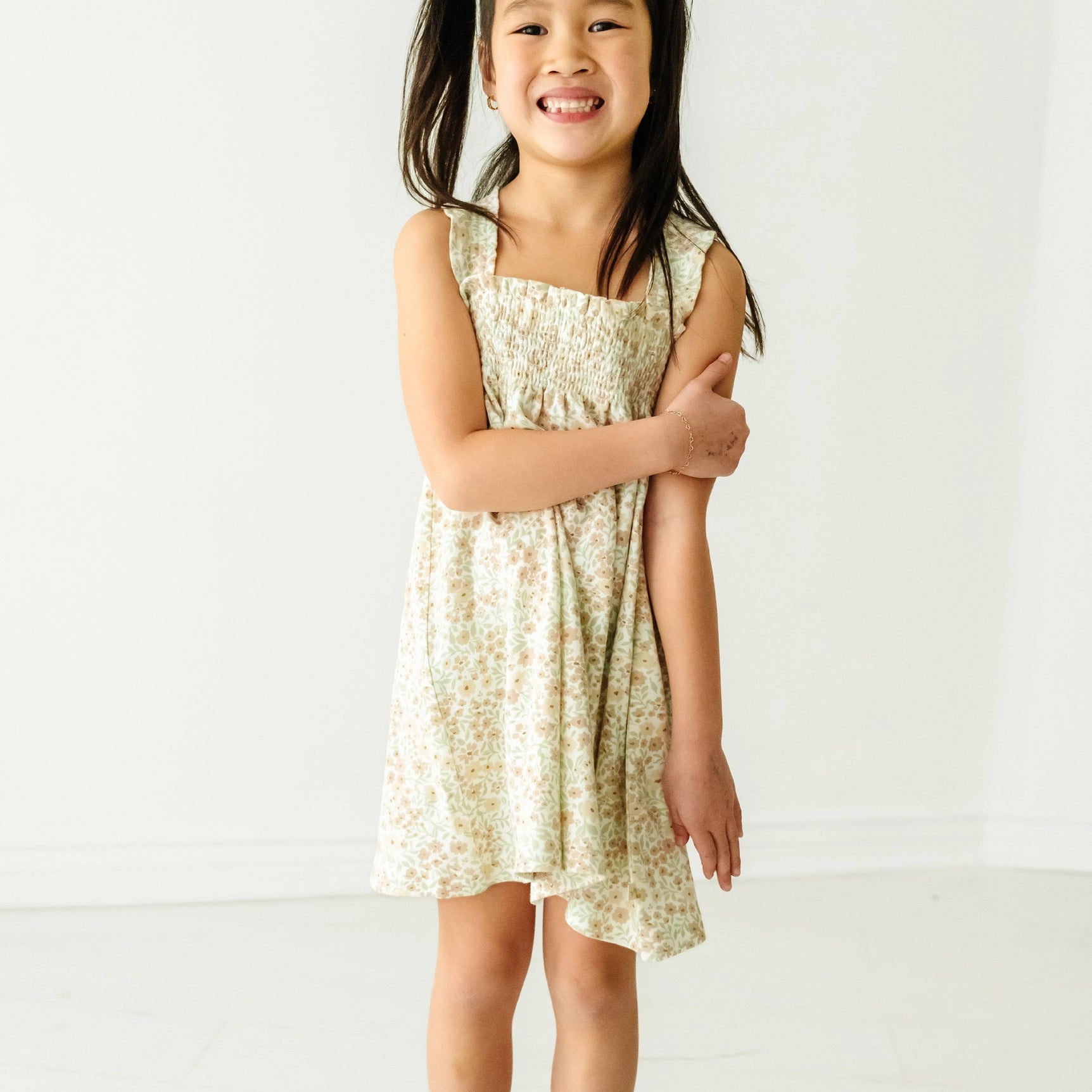 Get ready for sunny days with our Organic Smocked Sundress! Made of soft cotton, this sundress features a smocked empire bodice and a dainty floral print. Its fluttery skirt falls just above the knee, making it perfect for summer days. Bring a touch of charm to any occasion with this girl's summer style!