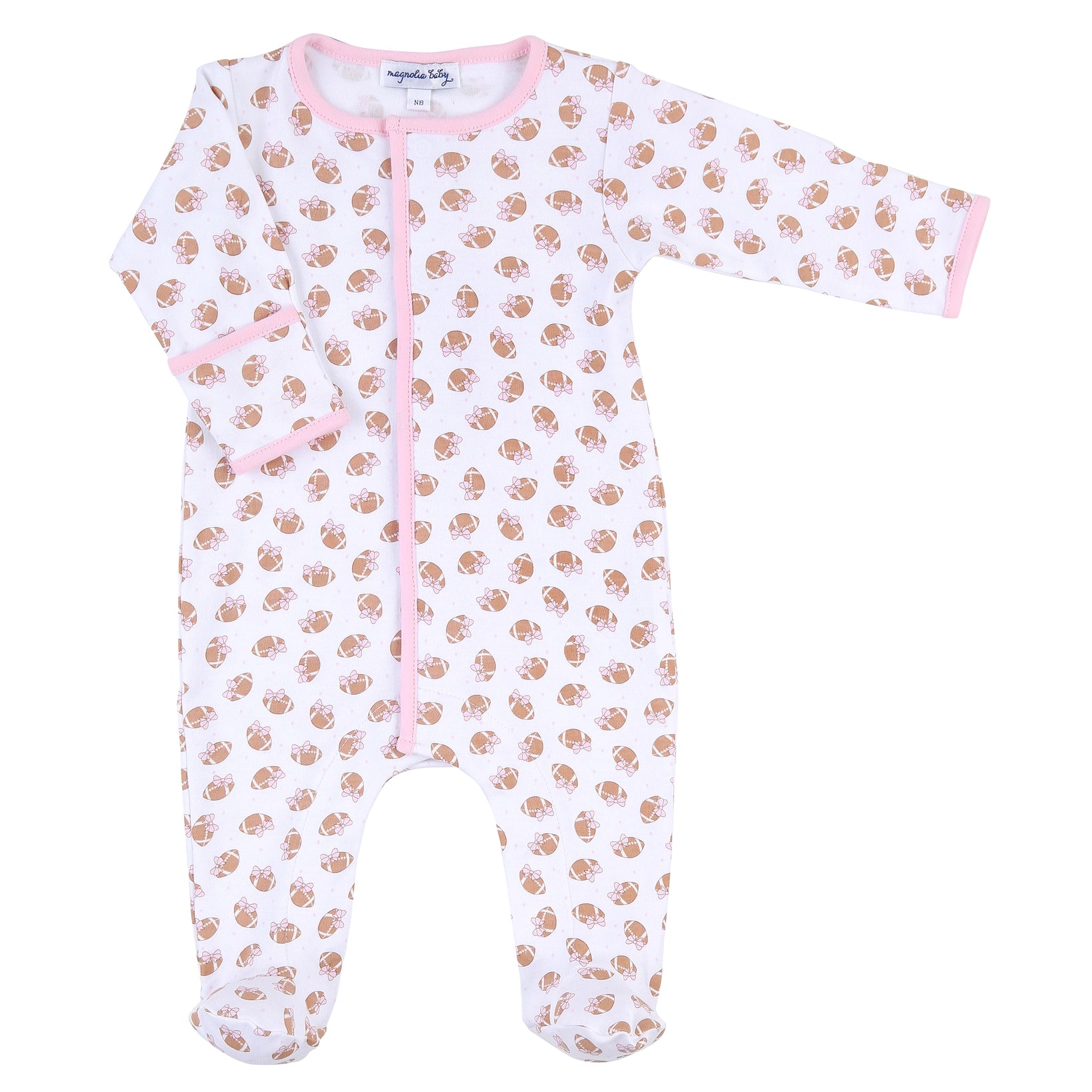 Get your tiny football fan ready for game day with our Magnolia baby football sleeper! Made with soft Pima cotton, this pink sleeper features a cute bow on the football. Perfect for your little one to nap in while they dream of touchdowns.